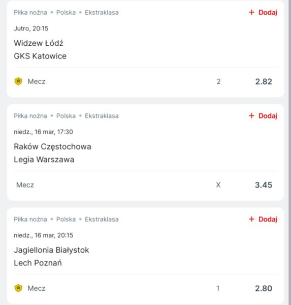 Jagiellonia w tym momencie jest na 3. miejscu w tabeli, ale ma tylko 2 punkty straty do lidera. Wiosenne wyniki ekipy z Białegostoku – zwycięstwo 5:0 z Radomiakiem, porażka 1:2 ze Stalą, wygrana 3:0 z Motorem, remis 2:2 z Cracovią, zwycięstwo 1:0 z GieKSą i Widzewem. Lider z Poznania wiosną nie zanotował jeszcze remisu, na początek wygrał z Widzewem 4:1, następnie przegrał 0:1 z Lechią i Rakowem. Ostatnie trzy mecze to trzy wygrane – 3:1 z Zagłębiem, 3:0 z Pogonią i 3:1 ze Stalą. Kurs na wygraną Jagiellonii 2,80. Kurs na remis 3,55. Kurs na zwycięstwo Lecha 2,50.