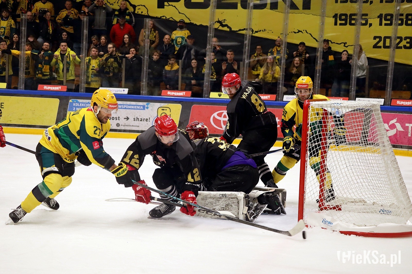 Właśnie w 2019 roku świętowaliśmy 10-lecie zgody z KSG. Podejmowaliśmy Gryf Wejheowo, a Blaszok zaprezentował transparent: „Łączy nas wiele złego i chuj wam do tego!”. Na sektorówce był Homer i Bart Simpson, którzy wspólnie pili piwo. Było to oczywiście nawiązanie do 2003 roku, kiedy będąc w Zabrzu i mając jeszcze kosę między sobą, zaprezentowaliśmy Homera, który dusił Barta. Nasza koalicja postanowiła uczcić rocznicę, ustawiając się na Piasta Gliwice, który jechał do Tychów, wspierać GKS Jastrzębie. Do niczego ostatecznie nie doszło, bo Piast wysiadł, ale obecni byli także mundurowi.