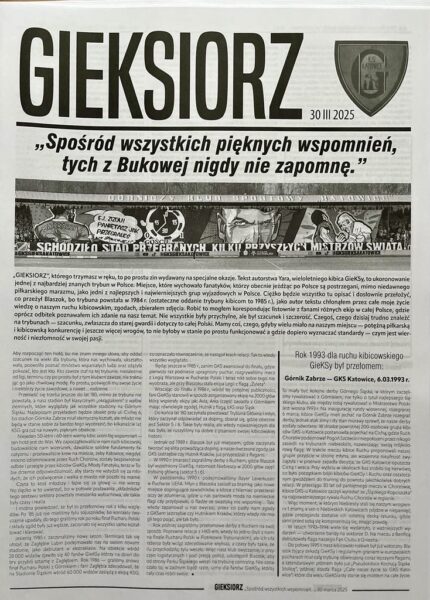 Drugi numer „GieKSiorza” skupia się na kibicowskiej historii Bukowej, ze szczególnym uwzględnieniem Blaszoka, który wychował całe pokolenia fanatyków GieKSy. Autorem szczegółowego tekstu jest dobrze Wam znany Yaro – twórca kibicowskich opisów, podsumowań oraz sylwetek rywali, które od lat regularnie pojawiają się na naszej stronie, najczęściej pod nickiem Eric Cantona. Yaro, wiedząc, że powierzchnia gazety jest ograniczona, skupił się na najważniejszych wątkach, a efektem jego pracy jest objętościowo… mała książka. Ostatecznego skrótu tekstu dokonał Welur, który jest też pomysłodawcą „GieKSiorza”. Nie wiemy jeszcze w jakiej formie i kiedy, ale do pełnej wersji artykułu od Yaro na pewno wrócimy i udostępnimy go Wam w przyszłości. W niedzielę natomiast będziecie mogli zapoznać się z najważniejszymi faktami dotyczącymi Blaszoka i jego kibiców. Przygotowaliśmy – podobnie jak przy pierwszym wydaniu – kilka tysięcy darmowych egzemplarzy.