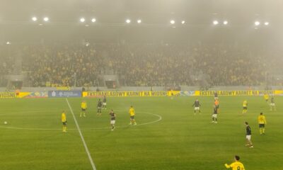 Po wejściu na stadion zobaczyłem taką właśnie oprószoną murawę – niezasypaną. Białawo-zieloną lub zielonkawo-białą. Typowy widok, gdy mamy pierwsze opady śniegu w roku lub też szron po mroźnej nocy. Białe gunwo (że tak zejdziemy z romantycznej wersji o puchu) ciągle jednak z białostockiego nieba spadało. I w pewnym momencie rzeczywiście murawa stała się dość biała. Nie przeszkodziło to jednak obu drużynom oraz sędziom rozgrzewać się. Kibice wypełniali stadion, zwłaszcza ci z Jagiellonii jeszcze przed meczem głośno dopingując swój zespół. Sympatycy GieKSy powoli zaczęli wchodzić na sektor gości i też dali znać o sobie. Przyznam, że nie myślałem w ogóle o tym, że mecz może się nie odbyć. Nie miałem takiego konceptu w głowie.