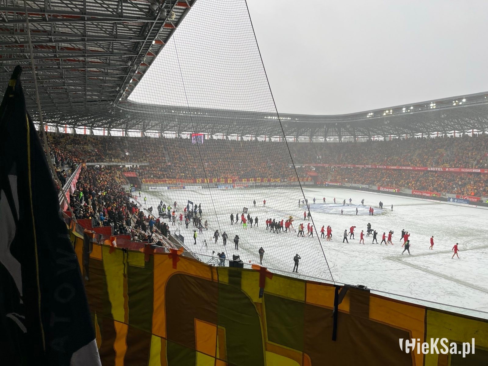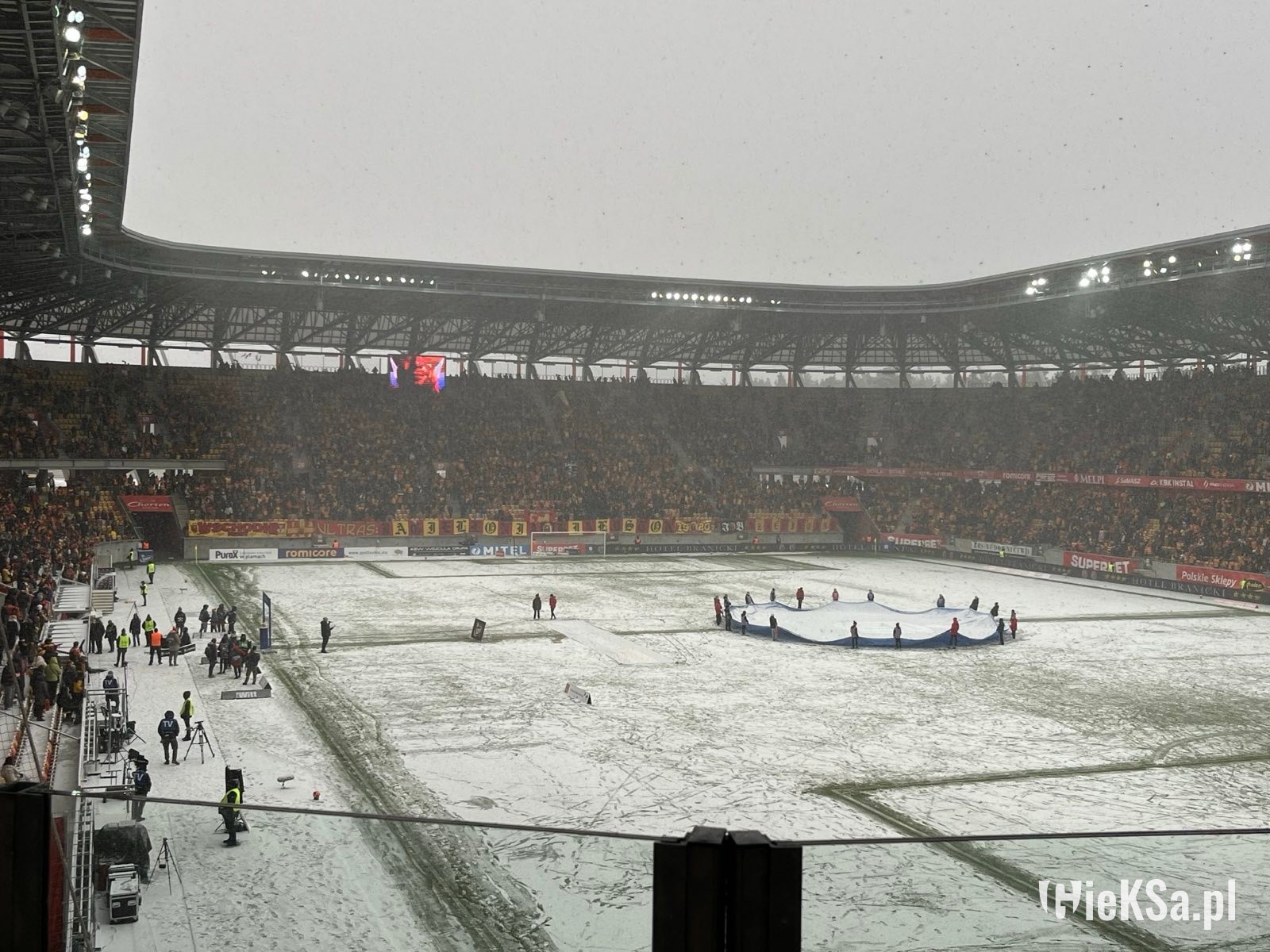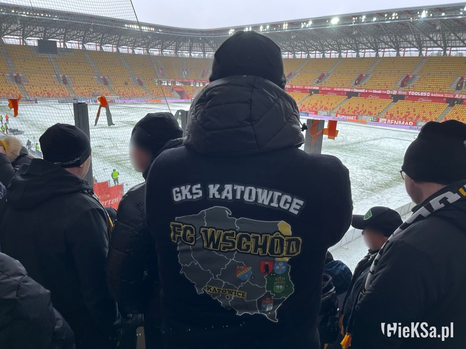 Po wejściu na stadion zobaczyłem taką właśnie oprószoną murawę – niezasypaną. Białawo-zieloną lub zielonkawo-białą. Typowy widok, gdy mamy pierwsze opady śniegu w roku lub też szron po mroźnej nocy. Białe gunwo (że tak zejdziemy z romantycznej wersji o puchu) ciągle jednak z białostockiego nieba spadało. I w pewnym momencie rzeczywiście murawa stała się dość biała. Nie przeszkodziło to jednak obu drużynom oraz sędziom rozgrzewać się. Kibice wypełniali stadion, zwłaszcza ci z Jagiellonii jeszcze przed meczem głośno dopingując swój zespół. Sympatycy GieKSy powoli zaczęli wchodzić na sektor gości i też dali znać o sobie. Przyznam, że nie myślałem w ogóle o tym, że mecz może się nie odbyć. Nie miałem takiego konceptu w głowie.