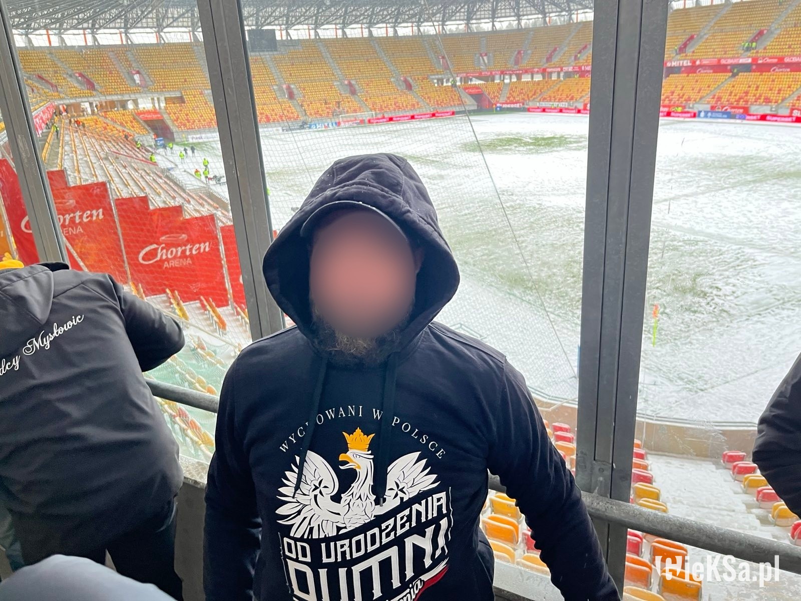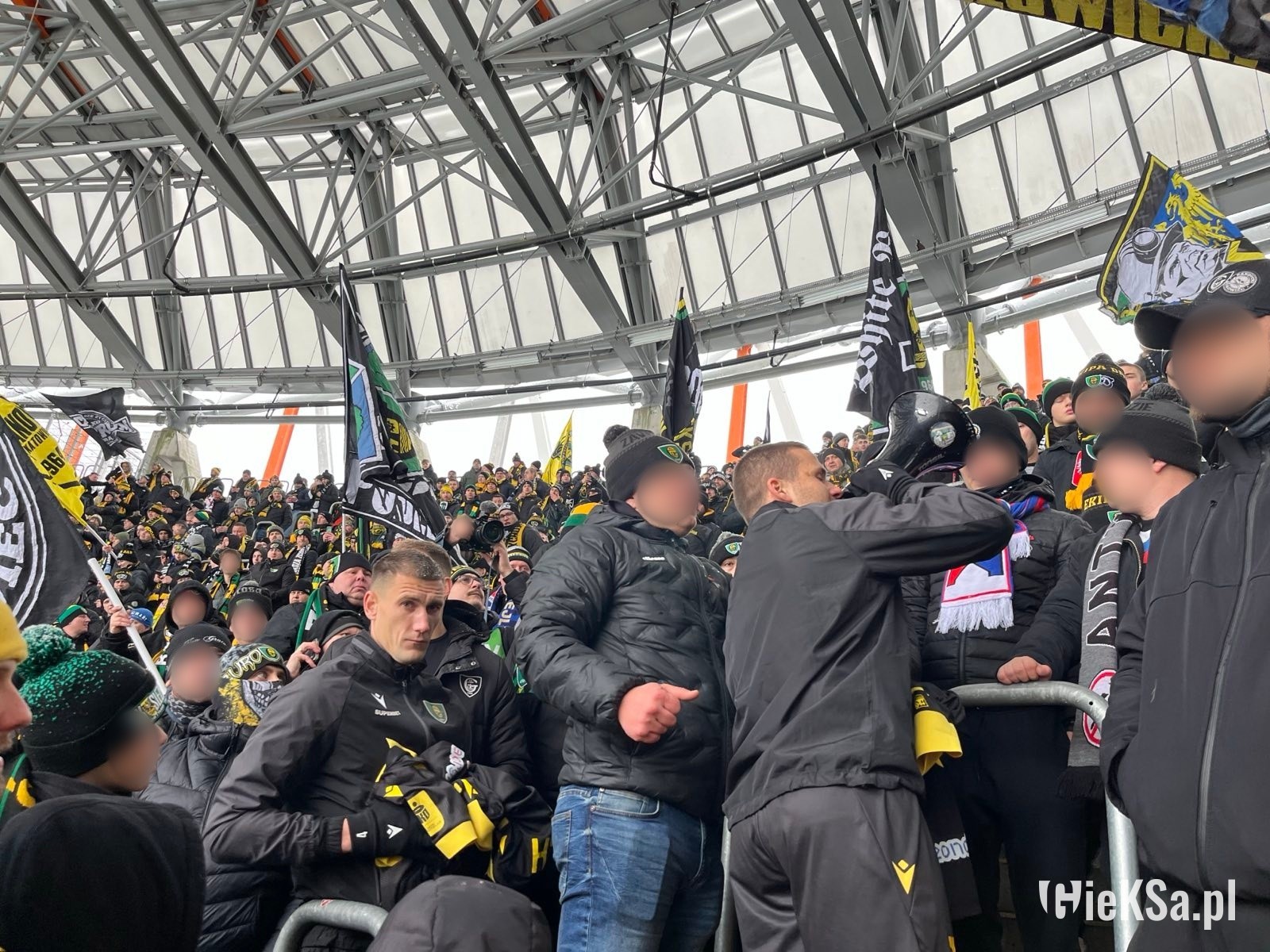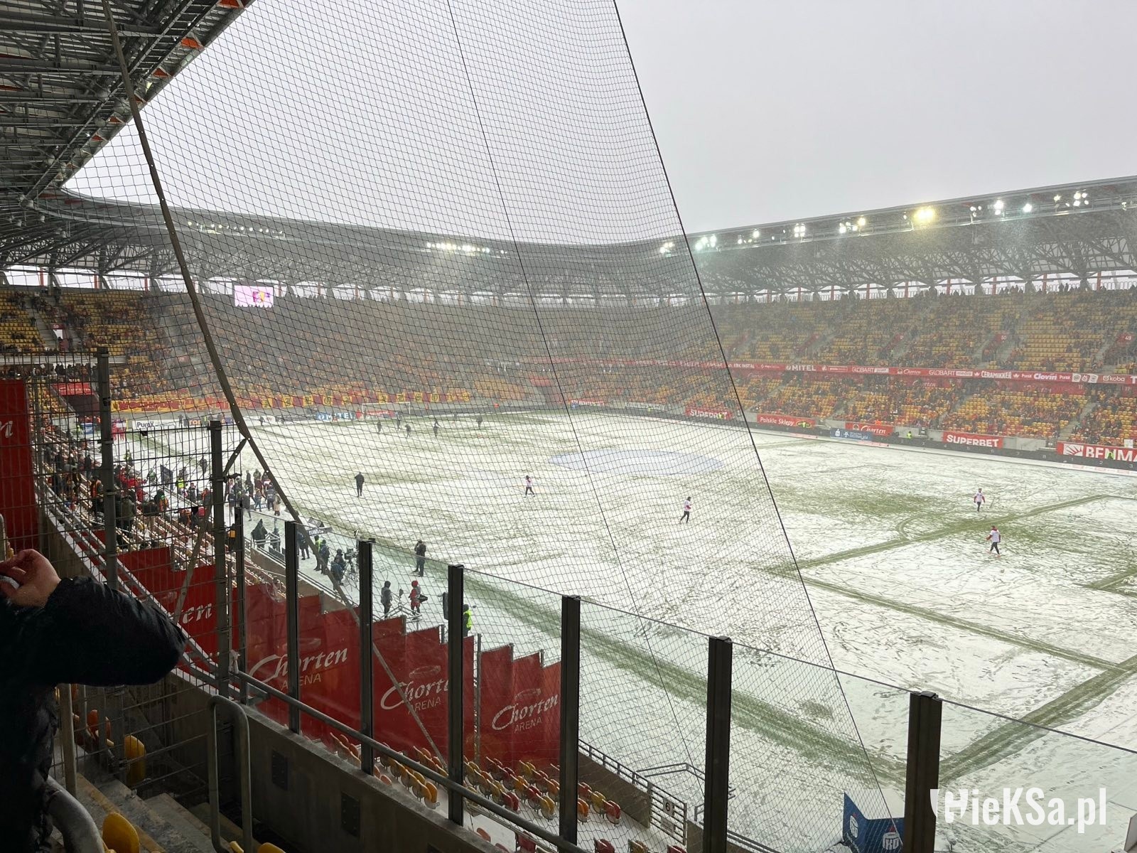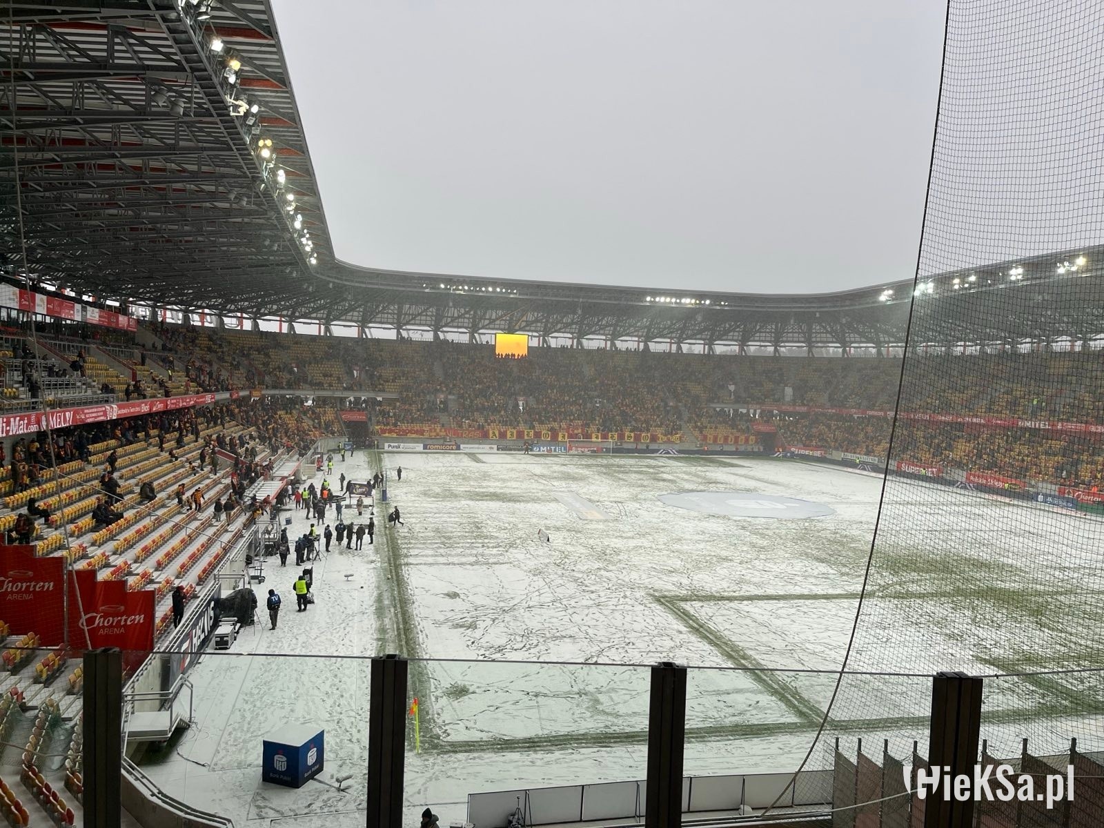 Po wejściu na stadion zobaczyłem taką właśnie oprószoną murawę – niezasypaną. Białawo-zieloną lub zielonkawo-białą. Typowy widok, gdy mamy pierwsze opady śniegu w roku lub też szron po mroźnej nocy. Białe gunwo (że tak zejdziemy z romantycznej wersji o puchu) ciągle jednak z białostockiego nieba spadało. I w pewnym momencie rzeczywiście murawa stała się dość biała. Nie przeszkodziło to jednak obu drużynom oraz sędziom rozgrzewać się. Kibice wypełniali stadion, zwłaszcza ci z Jagiellonii jeszcze przed meczem głośno dopingując swój zespół. Sympatycy GieKSy powoli zaczęli wchodzić na sektor gości i też dali znać o sobie. Przyznam, że nie myślałem w ogóle o tym, że mecz może się nie odbyć. Nie miałem takiego konceptu w głowie.