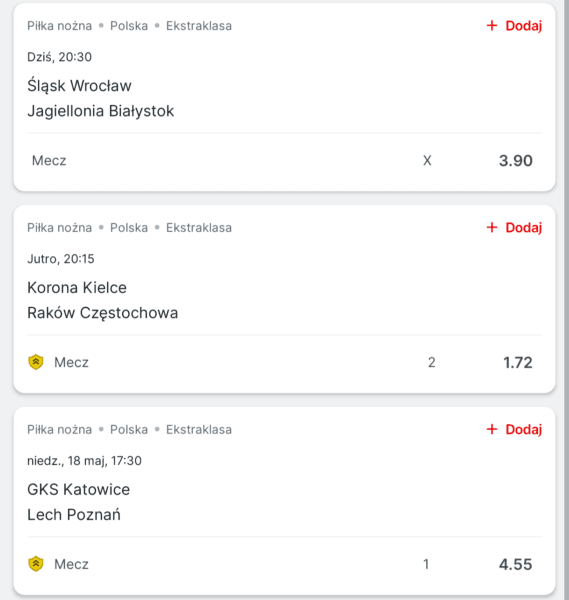 Katowiczanie są bezkompromisowi, ostatni remis podopiecznych Rafała Góraka to połowa lutego i domowy mecz z Piastem. Od tamtej pory GKS przegrał 6 i wygrał 5 spotkań, żeby wyrównać ten bilans, trzeba wygrać z liderem z Poznania. GieKSa obecnie jest na 7. miejscu w tabeli z szansami na zakończenie sezonu w pierwszej piątce, ale żeby to się stało, inne mecze musiałyby się ułożyć mocno po naszej myśli, a piłkarze z Nowej Bukowej musieliby wygrać pozostałe dwa mecze. Lech ostatnią porażkę ligową zanotował pod koniec marca, bilans Kolejorza od tamtej porażki – zwycięstwa 2:0 z Koroną, 2:1 z Motorem i Cracovią, remis 2:2 z Radomiakiem, wygrane 8:1 z Puszczą i 1:0 z Legią. Poznaniacy wykorzystali potknięcia Rakowa, o czym niżej i niczym francuskie TGV pędzą w kierunku tytułu mistrzowskiego, ale pokrzyżować im plany może banda zakapiorów z Katowic. Kurs na wygraną GieKSy 4,55. Kurs na remis 4,10. Kurs na zwycięstwo Lecha 1,74.