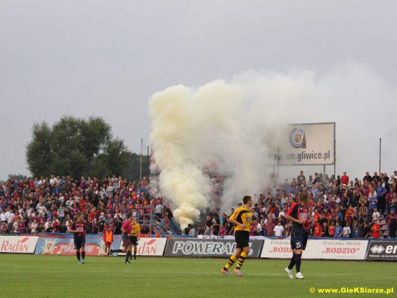 Ponownie spotkaliśmy się w 2010 roku, ale na jej zapleczu. Tym razem pojechaliśmy do Gliwic jesienią, już oficjalnie jako zgoda Górnika (od 2009 roku), więc ciśnienie między nami urosło. W klatce zameldowało się 330 głów, w tym 7 JKS Jarosław, z którym rok wcześniej odnowiliśmy relację oraz 5 fanów Banika. W trakcie meczu Piast wysypał się w naszym kierunku, ale była to bardziej pokazówka, którą szybko wyjaśniła ochrona, gazując oba sektory.