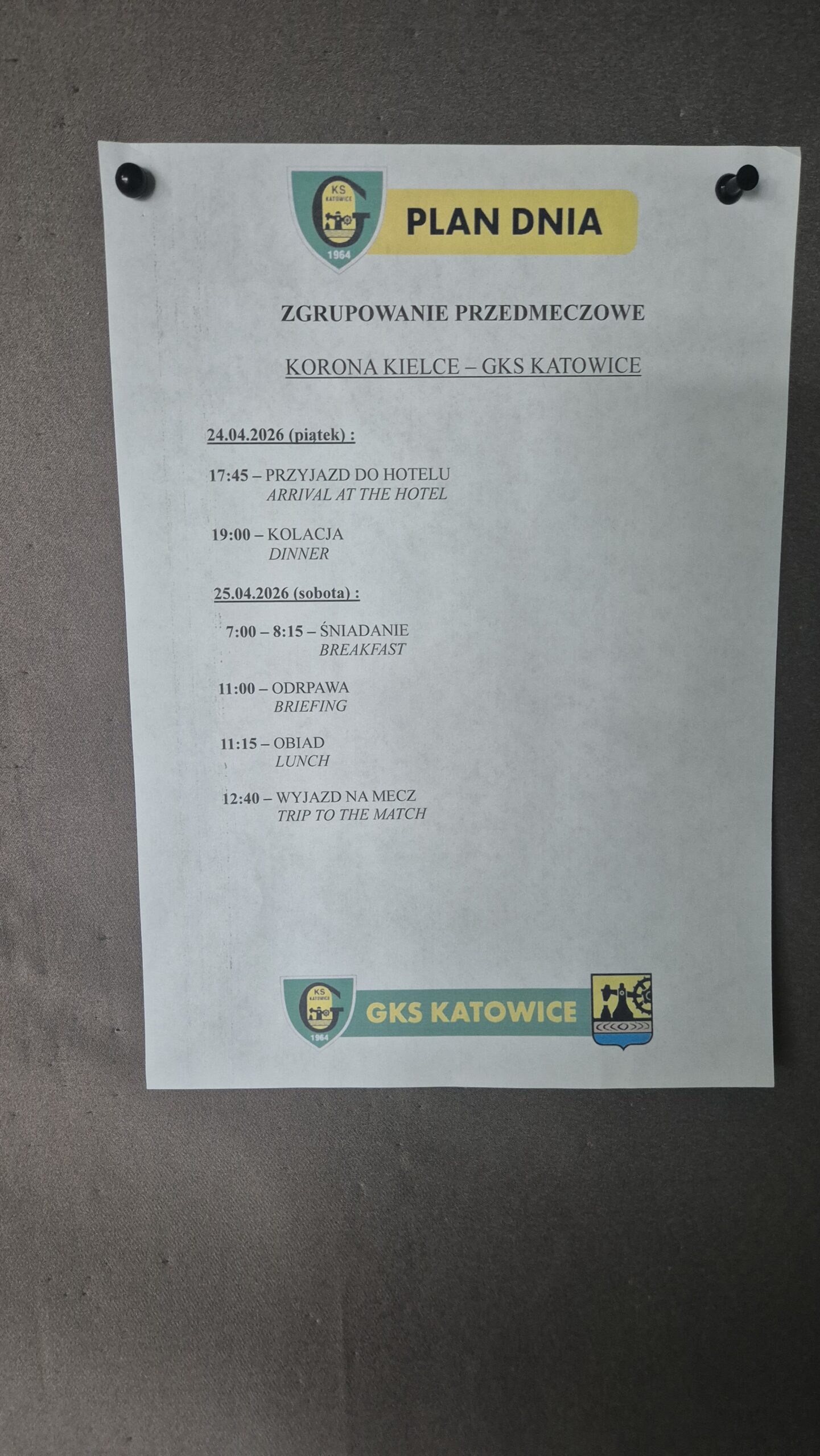 4. Gdy już wychodziłem z hotelu – o jaka mnie niespodzianka złapała. Zobaczyłem w holu rozpiskę. Ale nie byle jaką rozpiskę. To była rozpiska… GKS Katowice. Okazało się bowiem, że przypadkiem zabukowałem sobie ten sam hotel co drużyna.