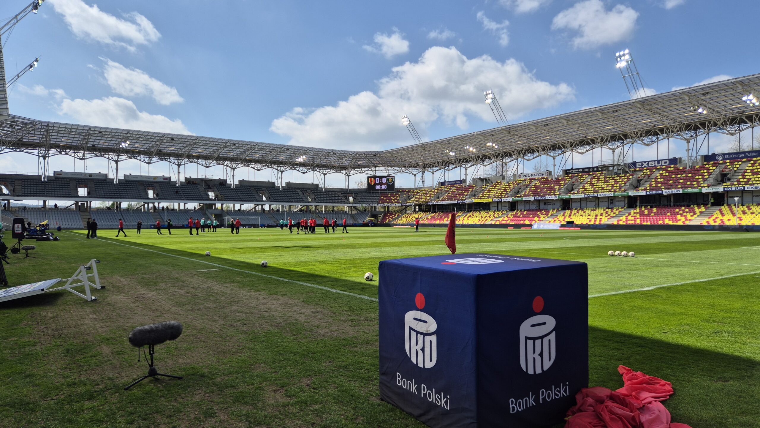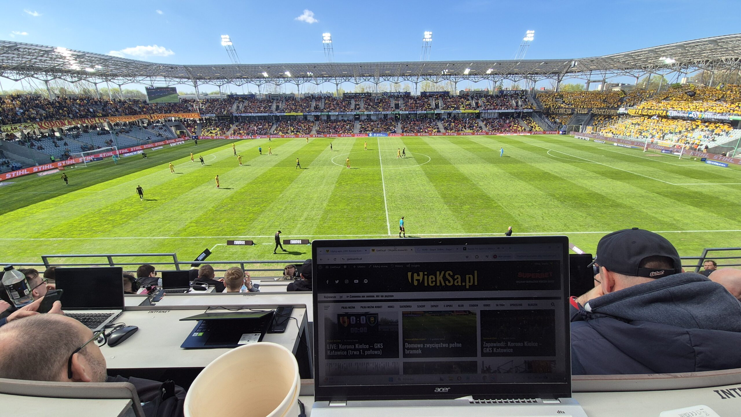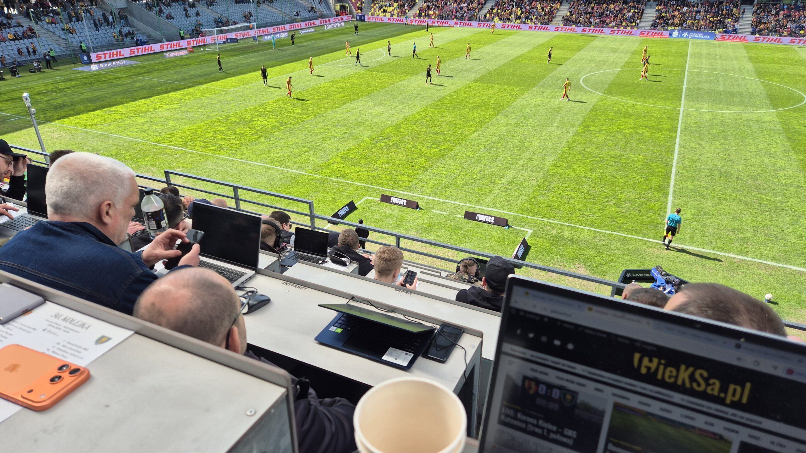 14. Skierowaliśmy się z powrotem – już na sektor prasowy. To pierwszy stadion od powrotu do ekstraklasy, na którym zawitaliśmy po raz trzeci. Wiedzieliśmy więc co i jak – czym to się je. Nagrywka przedmeczowa i zajęliśmy miejsca. Takie bez stolików, ale z większą przestrzenią. Więc komputer wylądował na kolanach.