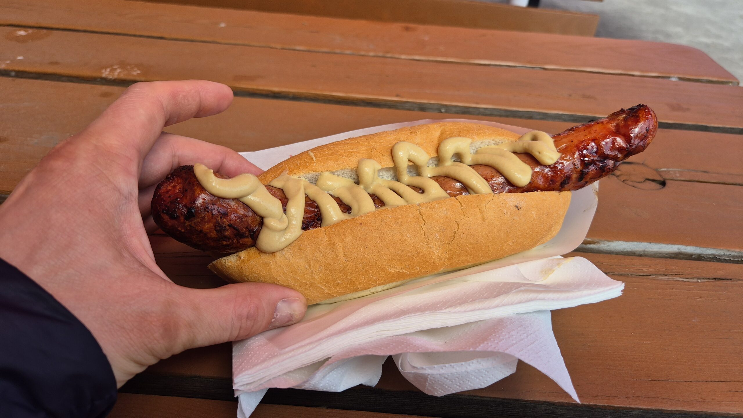 13. No panie, powiem ci – klasyczek. Półtorej (?) chyba kiełby i mnóstwo cebulki takiej zgrillowanej, w duuuużych kawałach. Musztarda, bułeczka. Smakowite. Minusem był ogórek kiszony, który ani trochę nie był kwaśny.