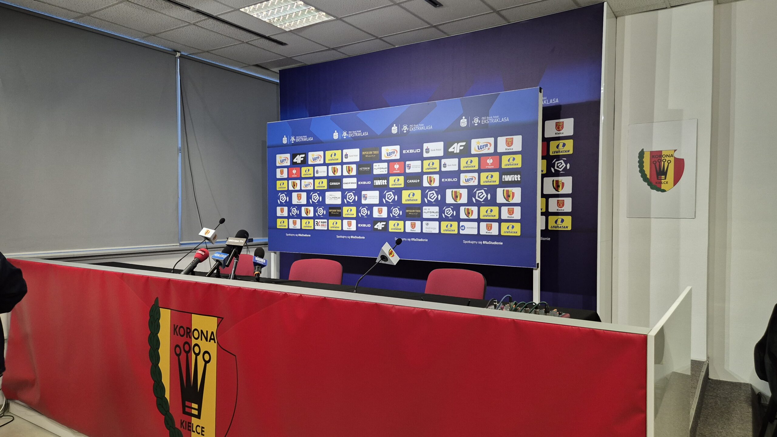 49. Po meczu nagrywka i przejście do sali konferencyjnej. Niesamowicie szybko się ta konferencja zaczęła. Zazwyczaj od włączenia dyktafonu po przyjściu na salkę do końca konfy mija ok. 40 minut. Czasem jest dużo dłużej, jak któryś trener ma dużo pytań – po Lechu była to godzina. A teraz tylko 27 minut. Ultraszybko.