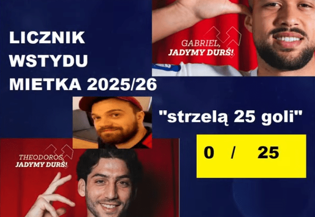 Licznik wstydu redaktora Mietczyńskiego – Popularny Mietek prowadzący Uniwersum Ekstraklasy rok temu dostał solidną dwóję, typując 25 goli Makucha z Musiolikiem. Rozochocony swoimi farmazonami wypiął pierś, wskazał przed tym sezonem na Tsirigotisa z Barbossą i dumnie rzucił: “To będzie duet killerów!”. A jakie były tego efekty wszyscy wiemy… O komentarz poprosiliśmy samego przepowiadającego przyszłość: “Niestety nastąpiła fatalna pomyłka scoutingowa i wybrałem prawie najgorszy duet napastników, jaki tylko mogłem. W zasadzie bardziej ośmieszyć mógłbym się tylko wtedy, gdybym postawił na Aleksandra Buksę z Maciejem Rosołkiem. Serdeczne pozdrowienia dla redakcji!”. My również pozdrawiamy i życzymy powodzenia w świetlanej karierze tenisowej, z dala od typowania killerów.