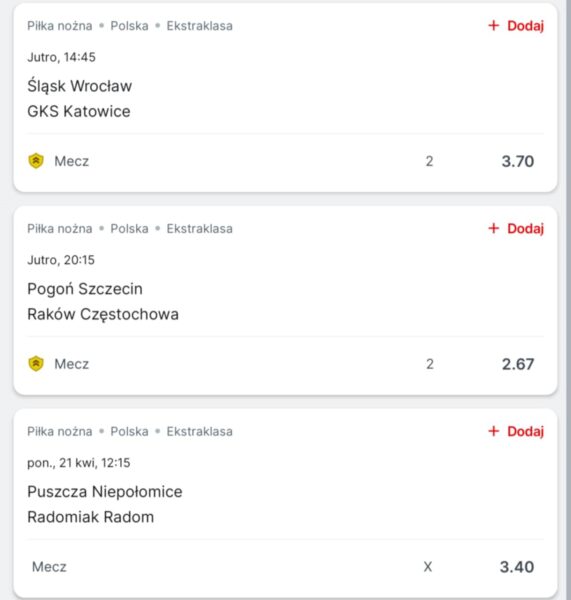 Pogoń ma jeszcze matematyczne szanse na ligowe podium na koniec sezonu. Ekipa ze Szczecina ma 8 punktów straty do Jagiellonii, 9 do Lecha i 12 do Rakowa. Ostatnie ligowe wyniki Pogoni – remis 1:1 ze Śląskiem, zwycięstwo 5:2 z Cracovią, bezbramkowy remis z Legią, wygrana 4:0 z GieKSą i porażka 1:2 z Piastem. Raków na ten moment jest liderem z trzema punktami przewagi nad Lechem. Częstochowianie w dziesięciu ligowych meczach rozegranych wiosną zanotowali tylko 2 remisy i aż 7 zwycięstw. Jedyną ekipą, która pokonała podopiecznych Marka Papszuna była GieKSa, a miało to miejsce 8 lutego. Minimalnym faworytem według bukmacherów jest Raków. Kurs na zwycięstwo Pogoni 2,77. Kurs na remis 3,30. Kurs na wygraną Rakowa 2,67.
