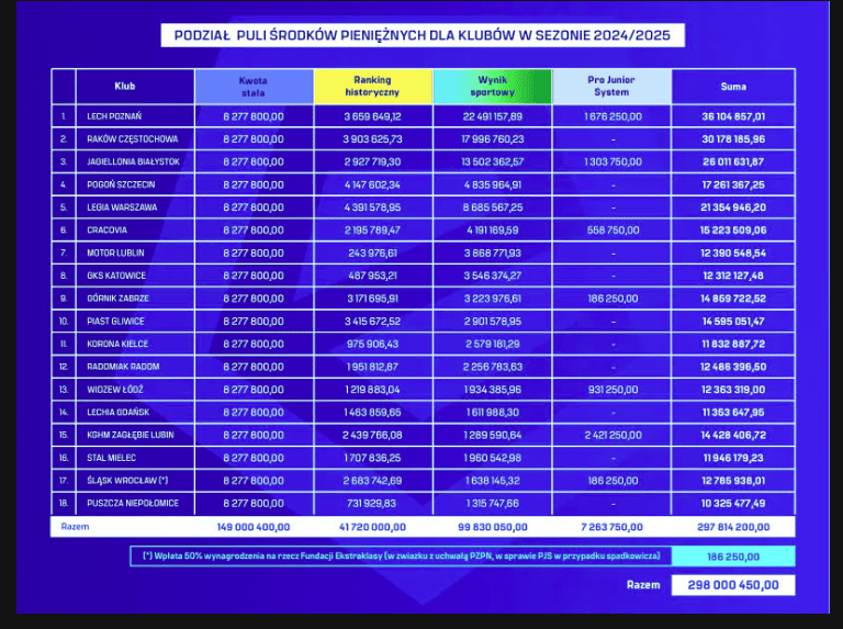 […] Wspomniane 36,1 mln zł otrzymał mistrzowski Lech Poznań, a 30,1 mln zł wicemistrz – Raków. Trzecia w tabeli Jagiellonia zgarnęła 26 mln zł. Najmniej w całej stawce zarobiła Puszcza Niepołomice, ale i tak przekroczyła barierę 10 mln zł.