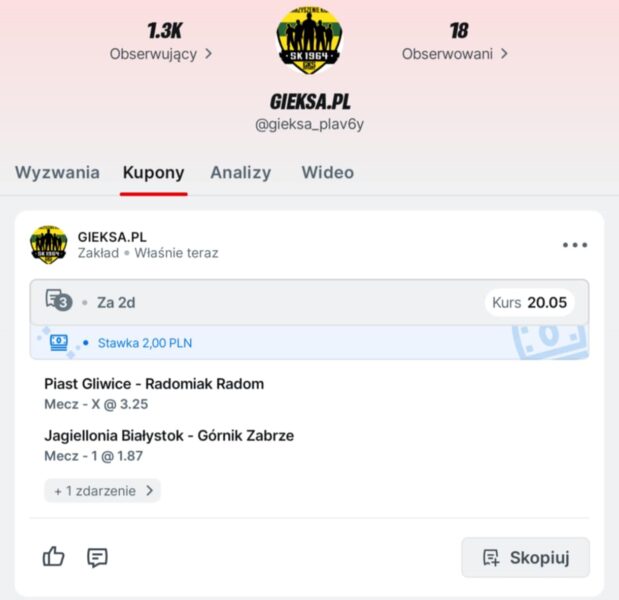 Przez tyle lat czekaliśmy na Puchar Polski jak na okno do Ekstraklasy z nadzieją, aby uchyliło się chociaż odrobinę i pozwoliło oddychać tym samym powietrzem co krajowa elita… Dzisiaj tuzy Ekstraklasy otwierają listę drużyn, z którymi nie chcemy grać na tym etapie. To najlepszy dowód na to, jaki skok wykonaliśmy przez ostatnie dwa lata: nomen omen lata świetlne! Z uwagi na zależności rodzinne (kuzyni z Dolnego Śląska kibicujący Śląskowi) najbardziej chciałbym trafić Śląsk na wyjeździe. U siebie zdążyliśmy zagrać i razem z kuzynami oglądaliśmy to „widowisko” na starej Bukowej. We Wrocławiu z uwagi na Święta nie mieliśmy szans się spotkać. Poza tym z uwagi na cykl „Okiem rywala” łapię kontakt z przedstawicielami innych klubów – z jednymi gorszy, z drugimi lepszy i czasem wbijamy sobie różne szpilki 😉 Tym kluczem chciałbym trafić na Widzew (pozdrawiam Michał) lub Koronę (piona Michał i marxokow). Górnik za to dopiero w finale, najlepiej na Śląskim, bo 3 maja córka ma komunię, więc logistyka byłaby łatwiejsza 😂 Rywali z niższych lig trochę się boję, z uwagi na stan boiska w grudniowe popołudnie, ale bytomski orlik powinien być wtedy jak najbardziej zdatny do użytku 😜 Tak czy inaczej, sam fakt, że w listopadzie rozmawiamy jeszcze o GieKSie w Pucharze Polski jest dla mnie powodem do uśmiechu. Czas na kolejny krok w stronę Narodowego.