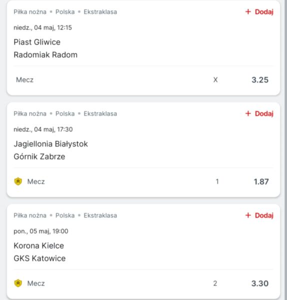 Piast i Radomiak nie mają jeszcze pewnego utrzymania w Ekstraklasie na kolejny sezon, ale obu ekipom brakuje już bardzo niewiele. Wyniki Piasta w poprzednich kolejkach – porażka 0:2 z Widzewem, remis 1:1 z Jagiellonią, zwycięstwo 2:1 z Pogonią, remis 1:1 z Koroną i przegrana 1:3 z Lechią. Gliwiczanie mają 9 punktów przewagi nad strefą spadkową. Radomiak ma 2 punkty mniej od najbliższego rywala. Ostatnie wyniki drużyny z Radomia – wygrana 3:1 z Koroną, porażki 0:1 z Zagłębiem i 1:2 z Rakowem, remisy 2:2 z Puszczą i Lechem. Według bukmacherów faworytem jest Piast. Kurs na wygraną Piasta 2,12. Kurs na remis 3,25. Kurs na zwycięstwo Radomiaka 3,85.