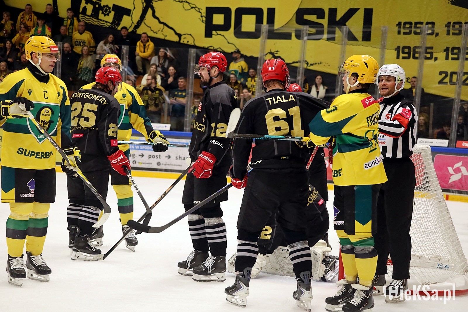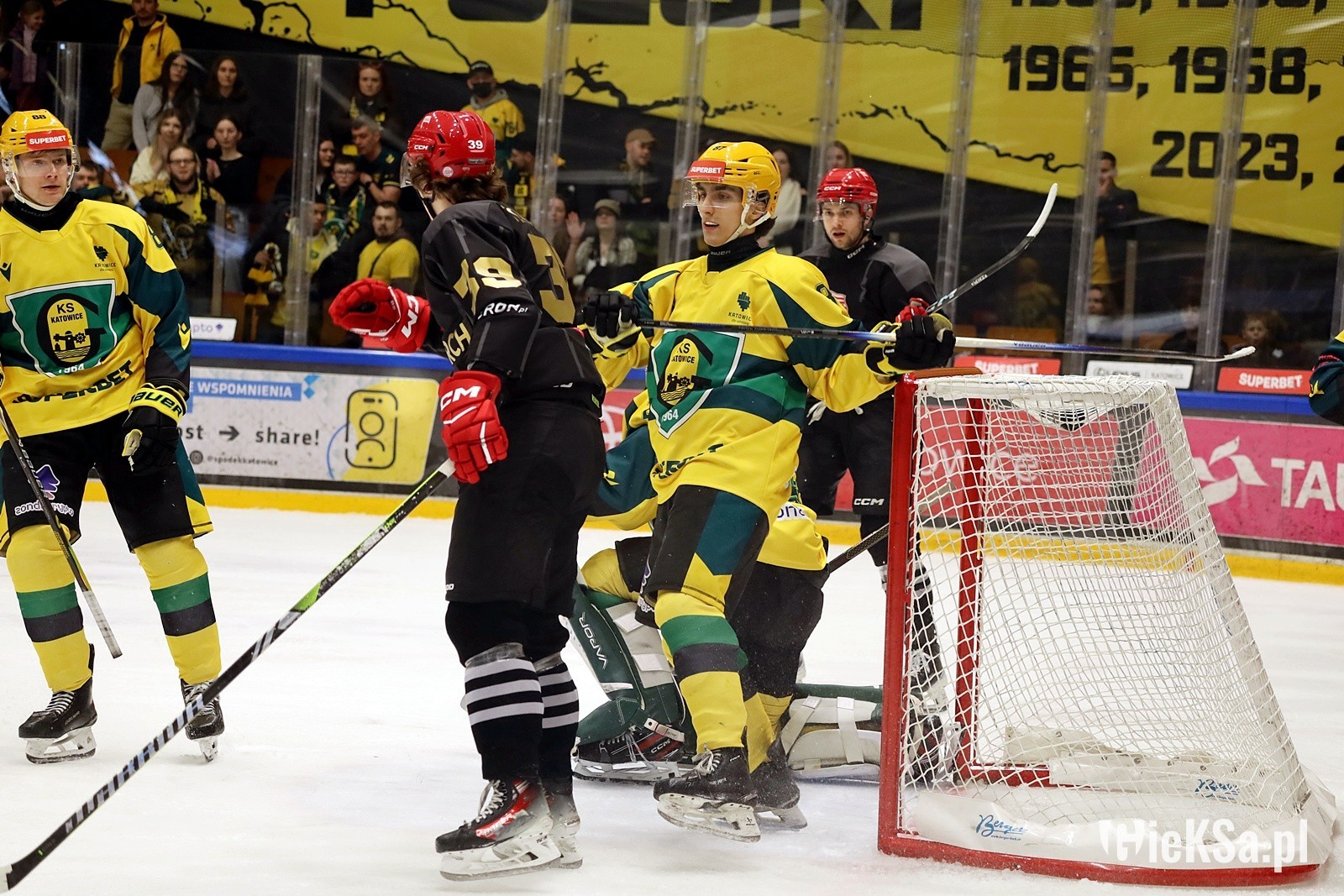 Właśnie w 2019 roku świętowaliśmy 10-lecie zgody z KSG. Podejmowaliśmy Gryf Wejheowo, a Blaszok zaprezentował transparent: „Łączy nas wiele złego i chuj wam do tego!”. Na sektorówce był Homer i Bart Simpson, którzy wspólnie pili piwo. Było to oczywiście nawiązanie do 2003 roku, kiedy będąc w Zabrzu i mając jeszcze kosę między sobą, zaprezentowaliśmy Homera, który dusił Barta. Nasza koalicja postanowiła uczcić rocznicę, ustawiając się na Piasta Gliwice, który jechał do Tychów, wspierać GKS Jastrzębie. Do niczego ostatecznie nie doszło, bo Piast wysiadł, ale obecni byli także mundurowi.