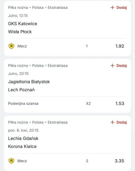 Również w sobotę Jagiellonia zmierzy się z Lechem. Gospodarze są na 3. miejscu w tabeli ze stratą 3 punktów do najbliższego rywala, który jest liderem. Jeśli Jaga przegra, to może znacznie skomplikować sobie dalszą walkę o tytuł mistrzowski. Wyniki podopiecznych Adriana Siemieńca w ostatnich kolejkach – 2:2 z Legią, 0:3 z Lechią, 1:2 z Piastem, 2:1 z GieKSą, 1:2 z Wisłą. Lider z Poznania punktuje na bardzo wysokim poziomie, w poprzednich meczach zanotował jedno potknięcie – porażkę 1:2 z Widzewem, poza tym wygrał cztery mecze – 2:1 z Koroną, 4:3 z Rakowem, 1:0 Zagłębiem i 4:1 z Niecieczą. Zdaniem bukmacherów minimalnym faworytem są gospodarze. Kurs na zwycięstwo Jagiellonii 2,57. Kurs na remis 3,60. Kurs na tryumf Lecha 2,67.