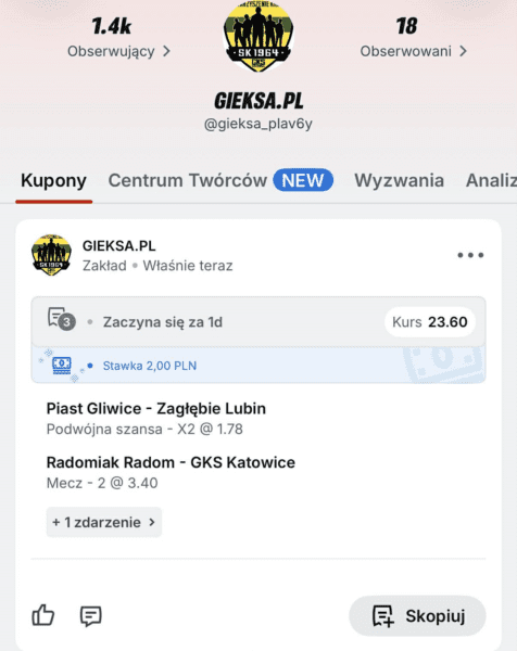 Po emocjonującym starciu z Widzewem i awansie do półfinału Pucharu Polski Katowiczanie zmierzą się na wyjeździe z Radomiakiem. GKS w lidze przełamał się i po remisie z Legią i porażce 1:2 z Arką wygrał w poprzedniej kolejce 3:1 z Górnikiem. Podopieczni Rafała Góraka plasują się w środku ligowej stawki, mają 4 punkty straty do 4. miejsca i 5 punktów przewagi nad Legią, która znajduje się w strefie spadkowej. Radomiak po wznowieniu rozgrywek odniósł tylko jedno zwycięstwo, wyniki w 2026 roku – 0:0 z Rakowem, 0:2 z Koroną, 1:1 z Jagiellonią i Niecieczą, 3:1 z Arką. Radomiak ma 2 punkty więcej od GieKSy, ale ma też jeden mecz rozegrany więcej. Kurs na zwycięstwo Radomiaka 2,17. Kurs na remis 3,50. Kurs na wygraną GieKSy 3,40.