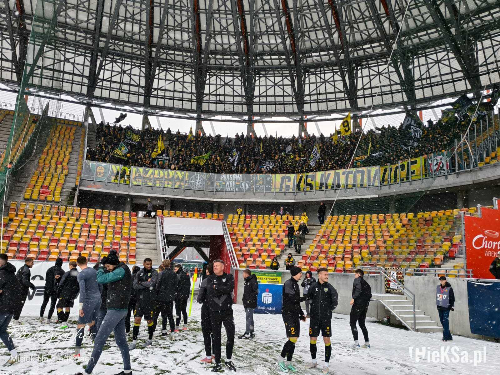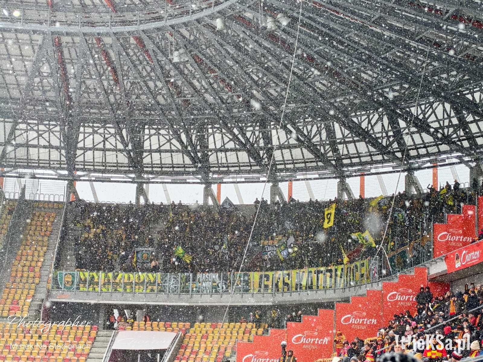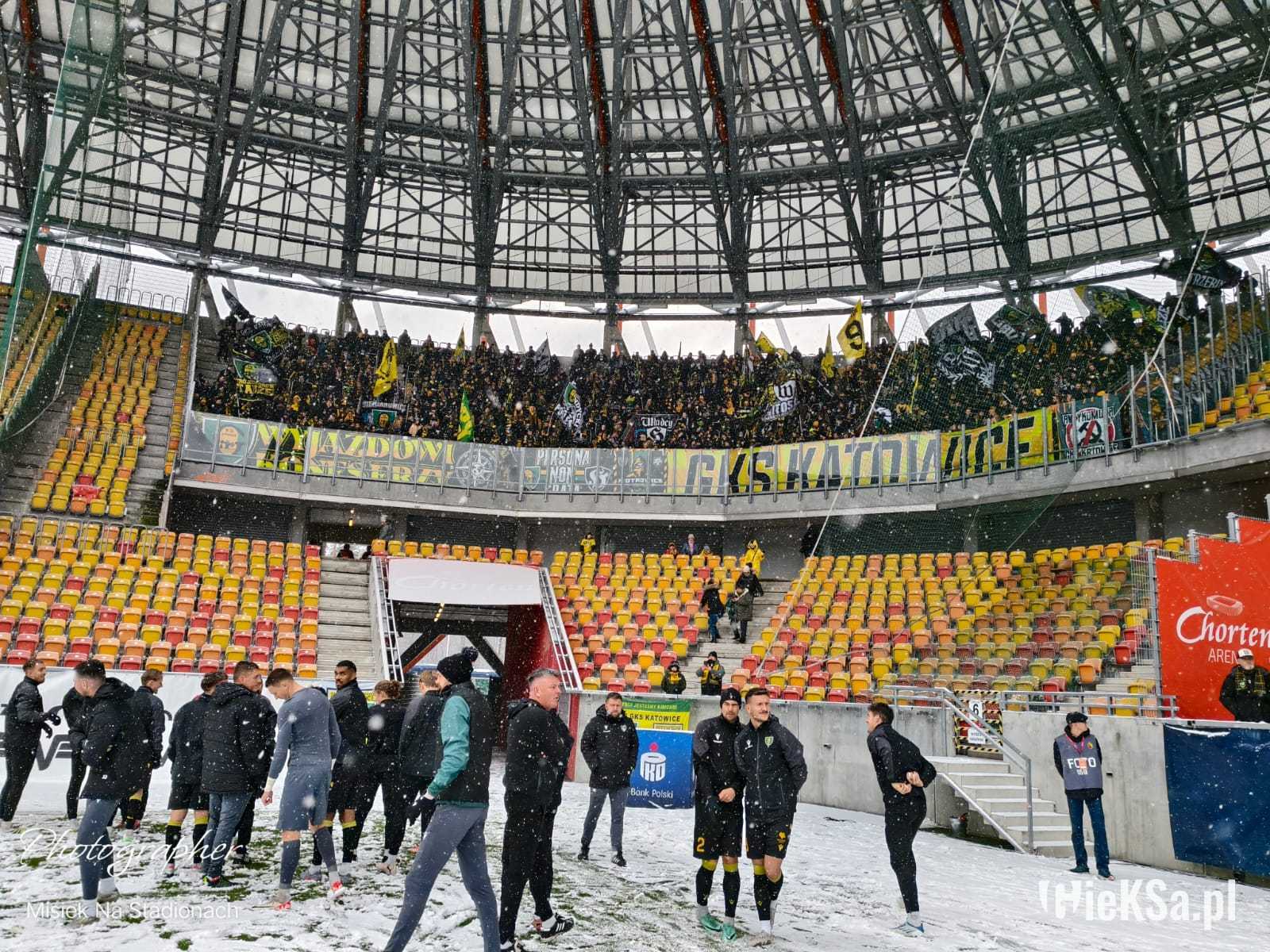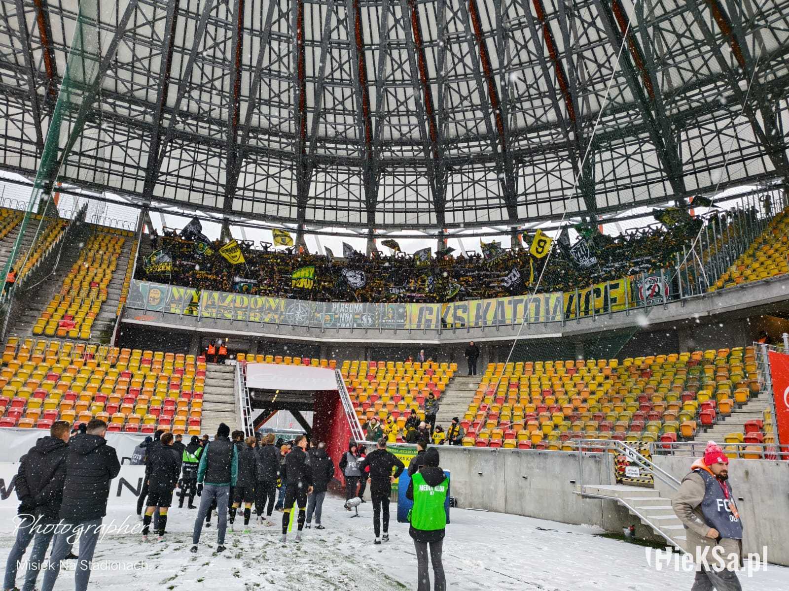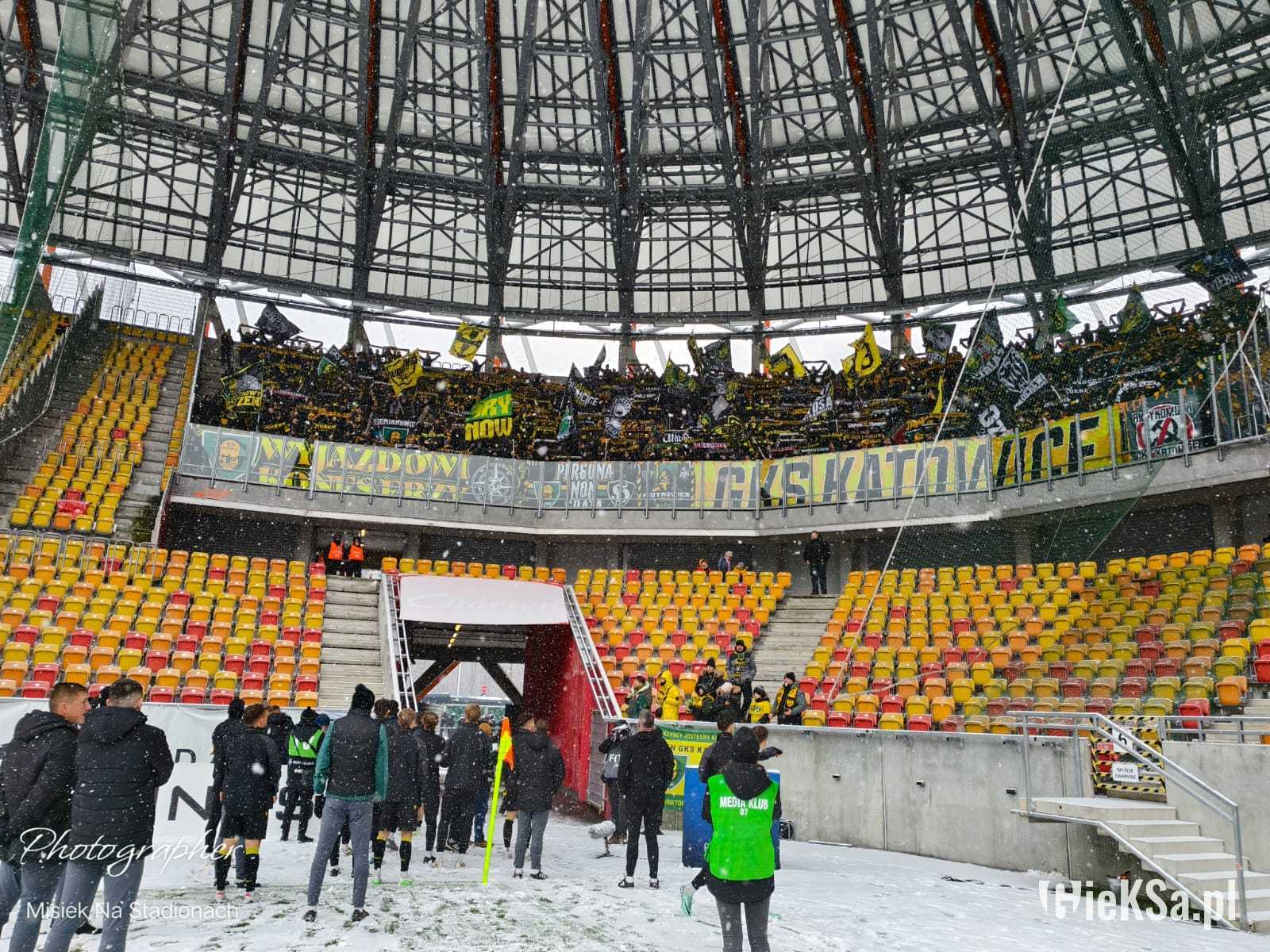 Zapraszamy do zimowej galerii z odwołanego meczu GieKSy z Jagiellonią w Białymstoku. Piłkarze GKS Katowice po decyzji o tym, że nie będzie spotkania, podeszli pod szczelnie wypełniony sektor gości i podziękowali fanom z Katowic za tak liczne stawienie się na meczu. Przy okazji podarowali swoje koszulki najmłodszym wyjazdowiczom.