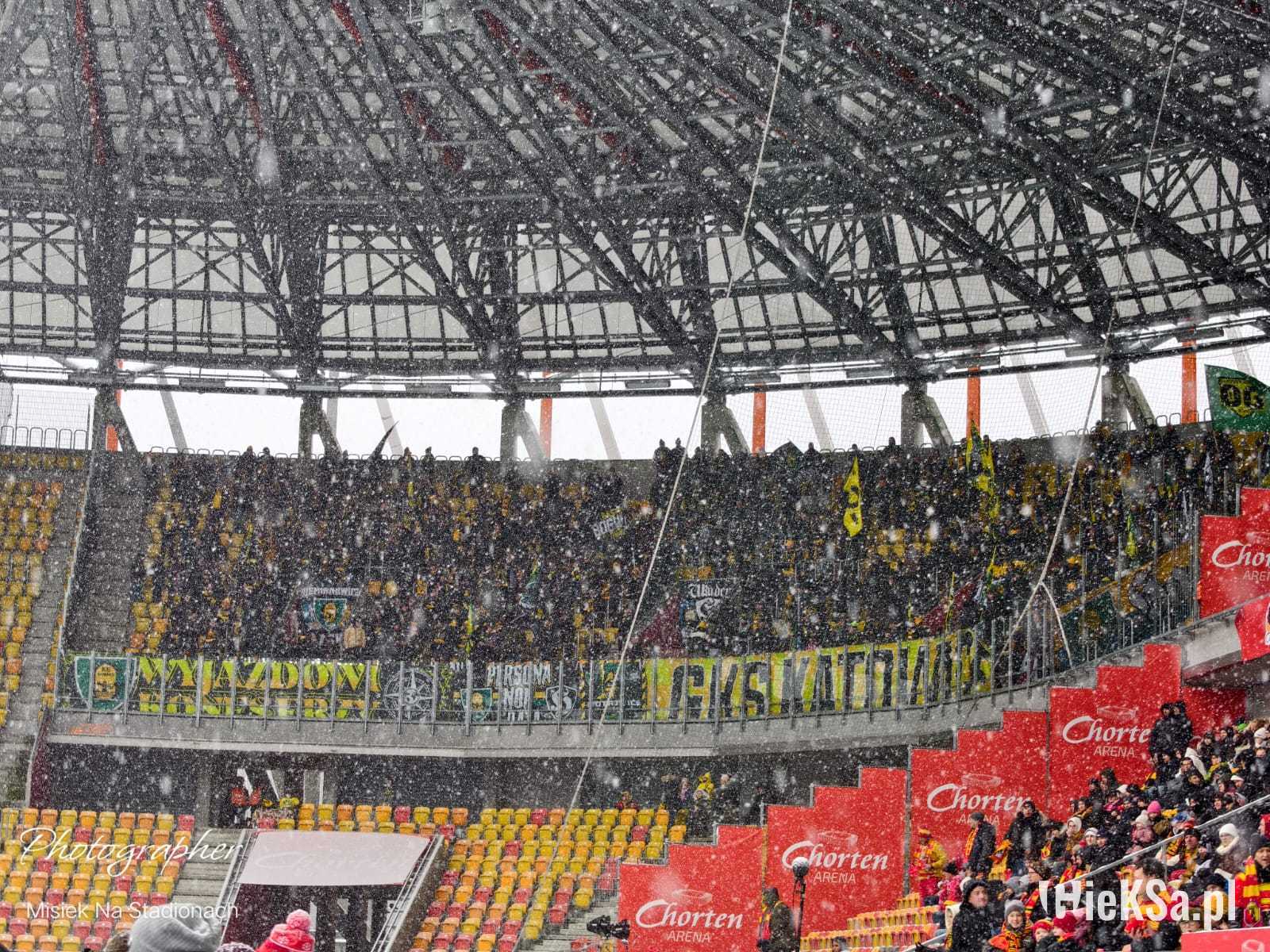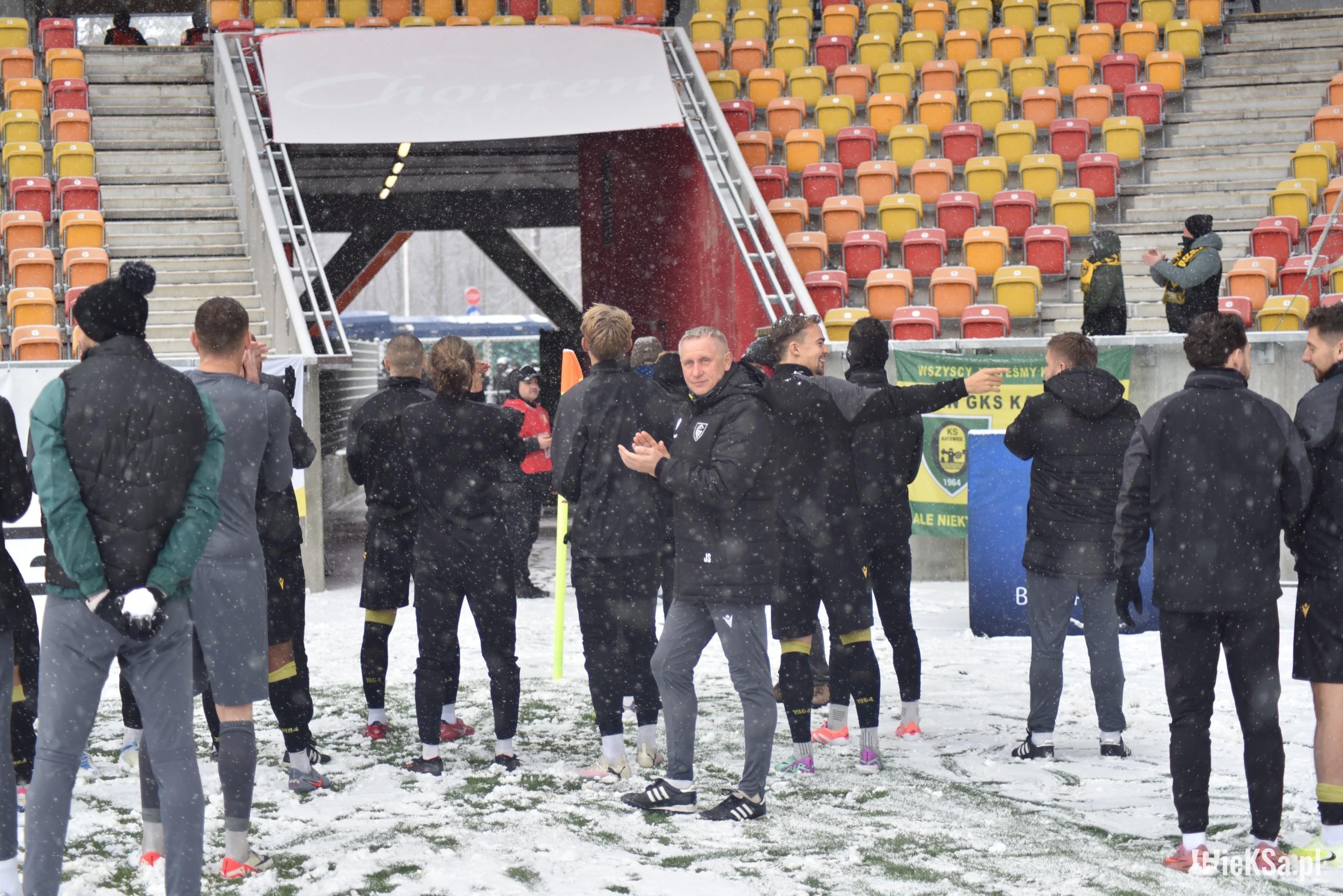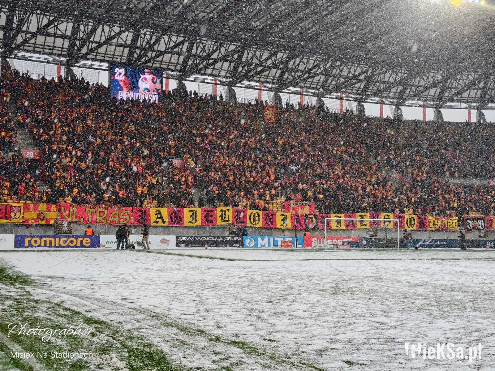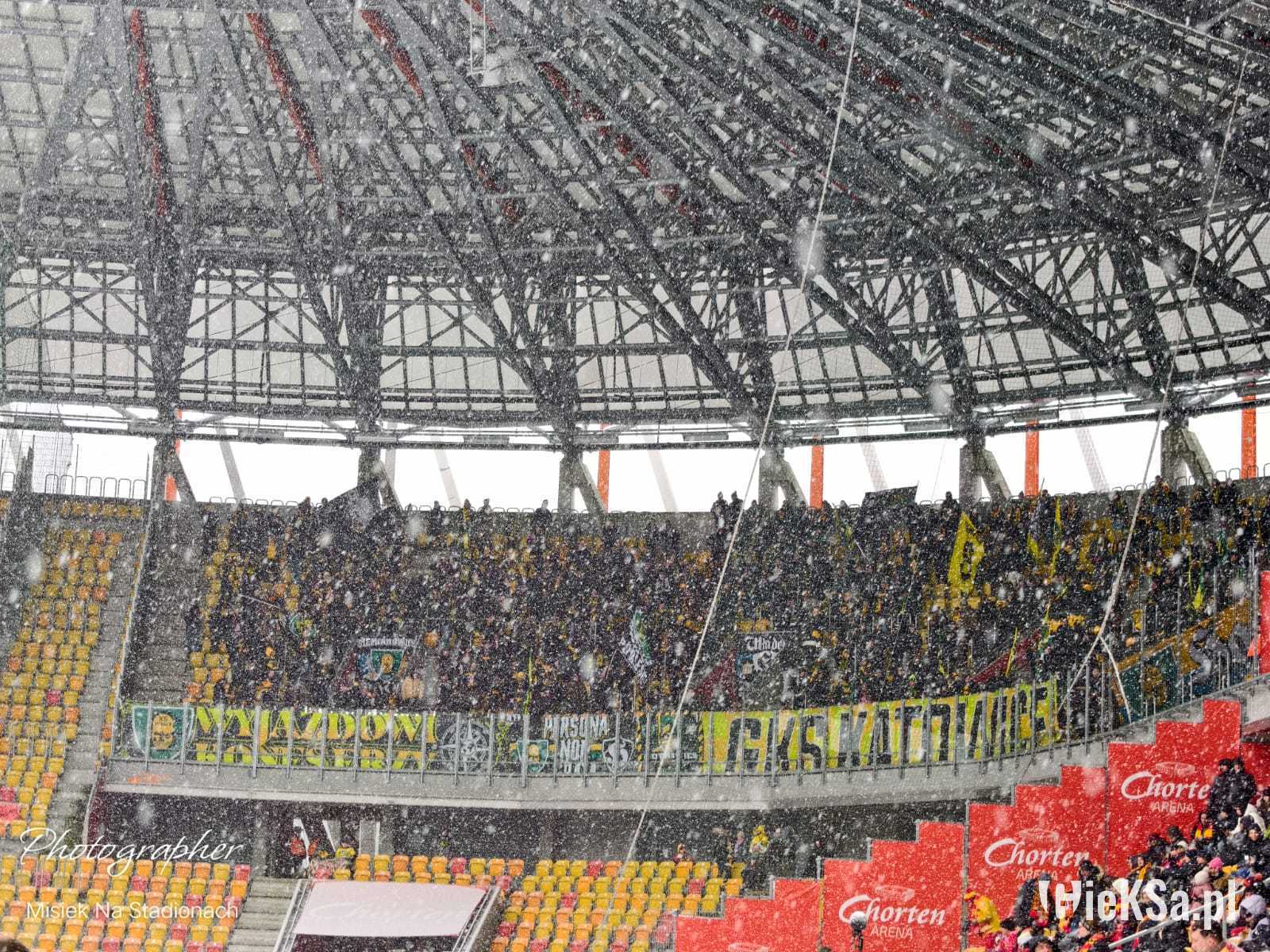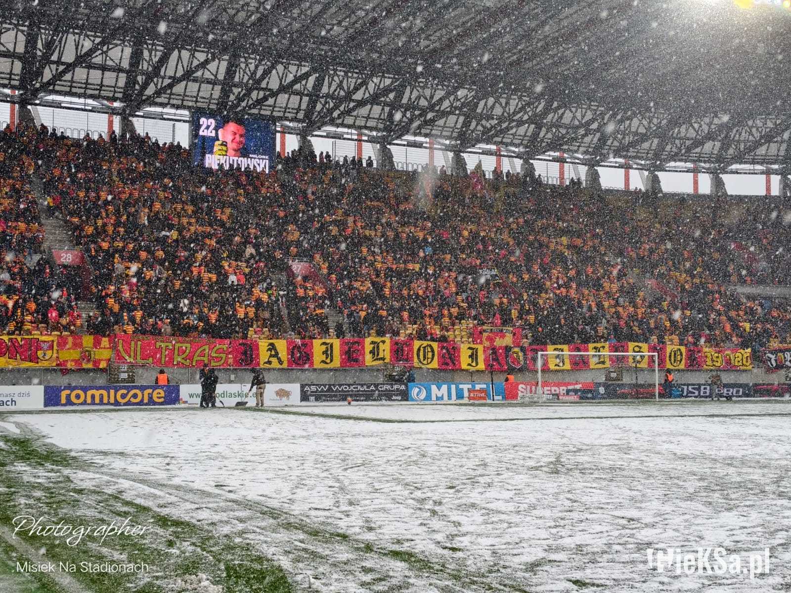 Zapraszamy do zimowej galerii z odwołanego meczu GieKSy z Jagiellonią w Białymstoku. Piłkarze GKS Katowice po decyzji o tym, że nie będzie spotkania, podeszli pod szczelnie wypełniony sektor gości i podziękowali fanom z Katowic za tak liczne stawienie się na meczu. Przy okazji podarowali swoje koszulki najmłodszym wyjazdowiczom.