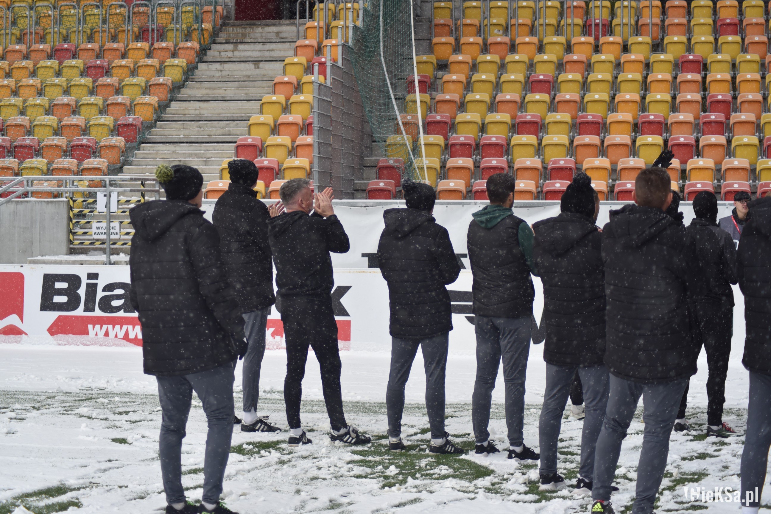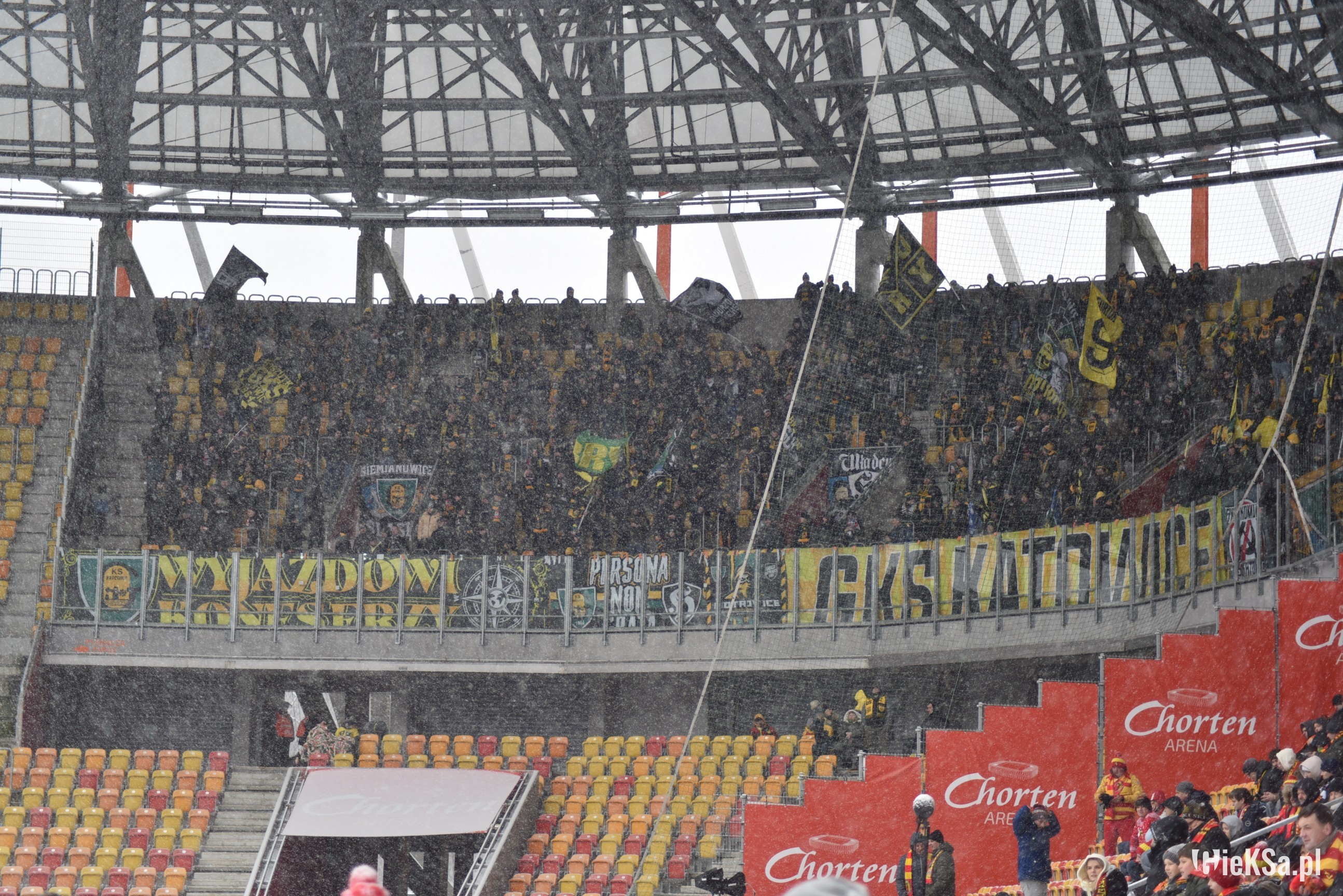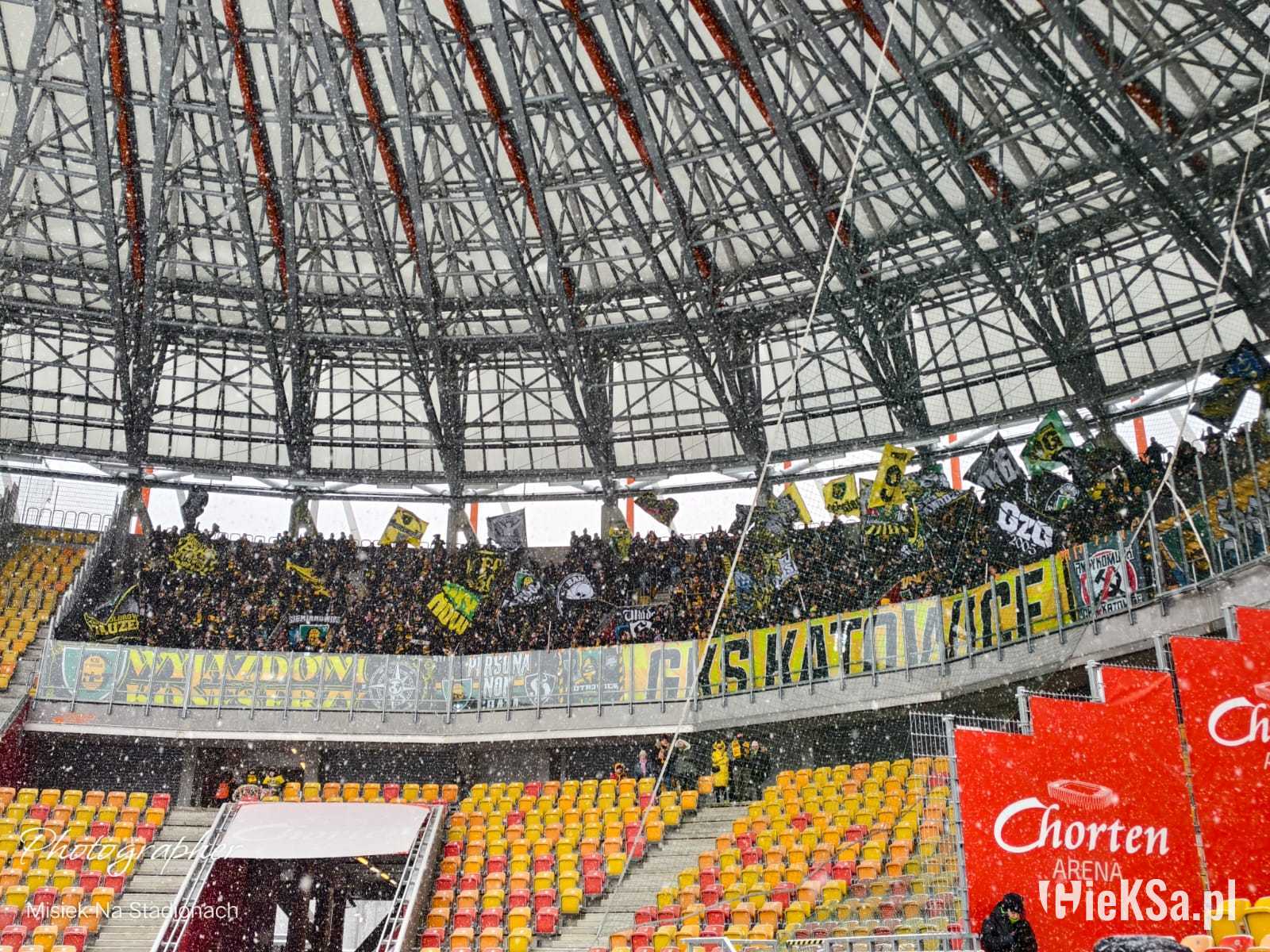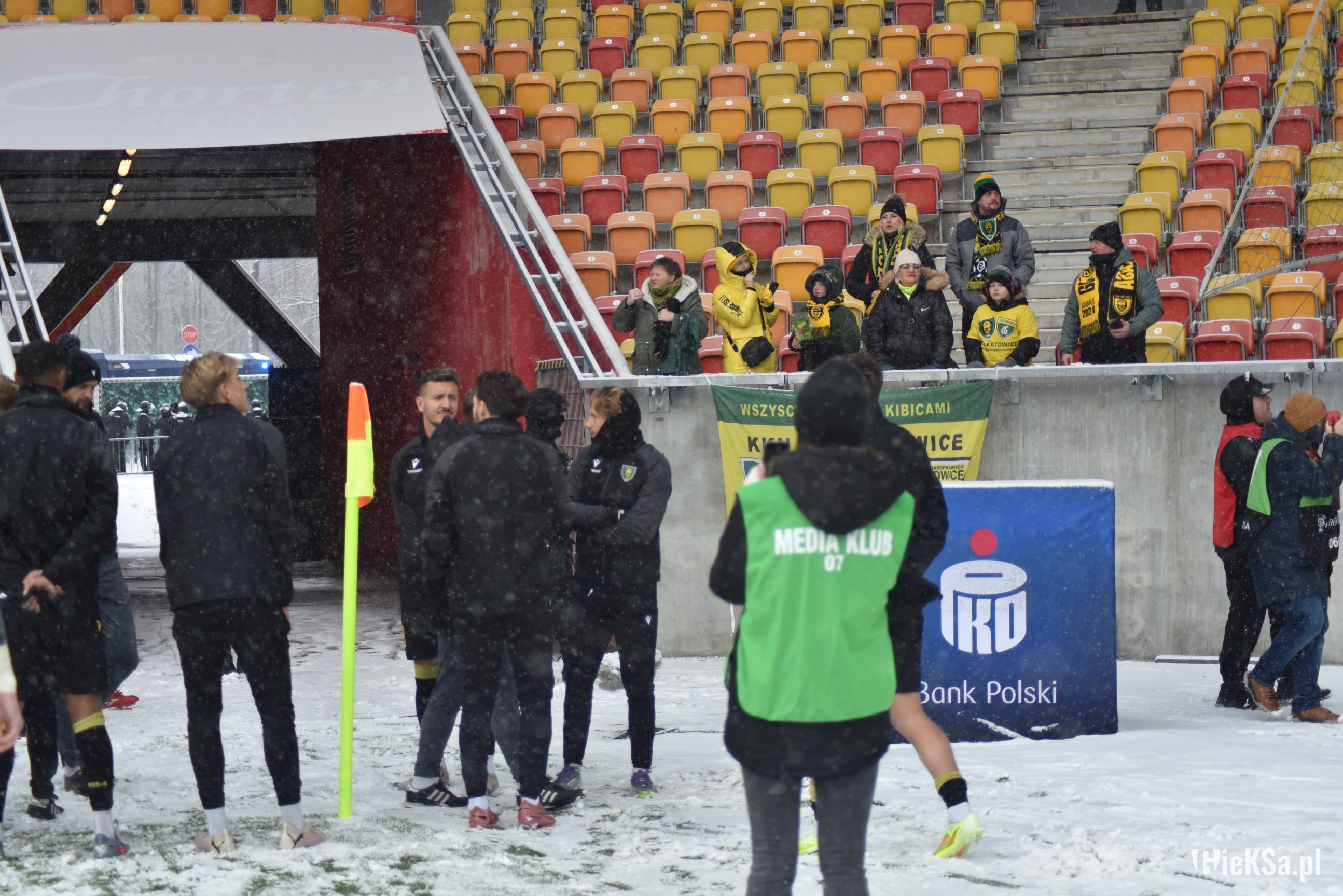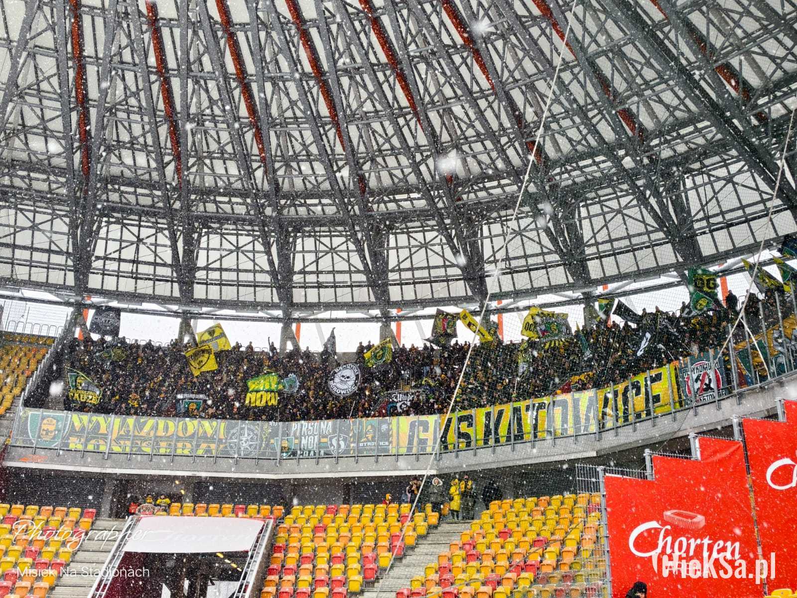 Zapraszamy do zimowej galerii z odwołanego meczu GieKSy z Jagiellonią w Białymstoku. Piłkarze GKS Katowice po decyzji o tym, że nie będzie spotkania, podeszli pod szczelnie wypełniony sektor gości i podziękowali fanom z Katowic za tak liczne stawienie się na meczu. Przy okazji podarowali swoje koszulki najmłodszym wyjazdowiczom.