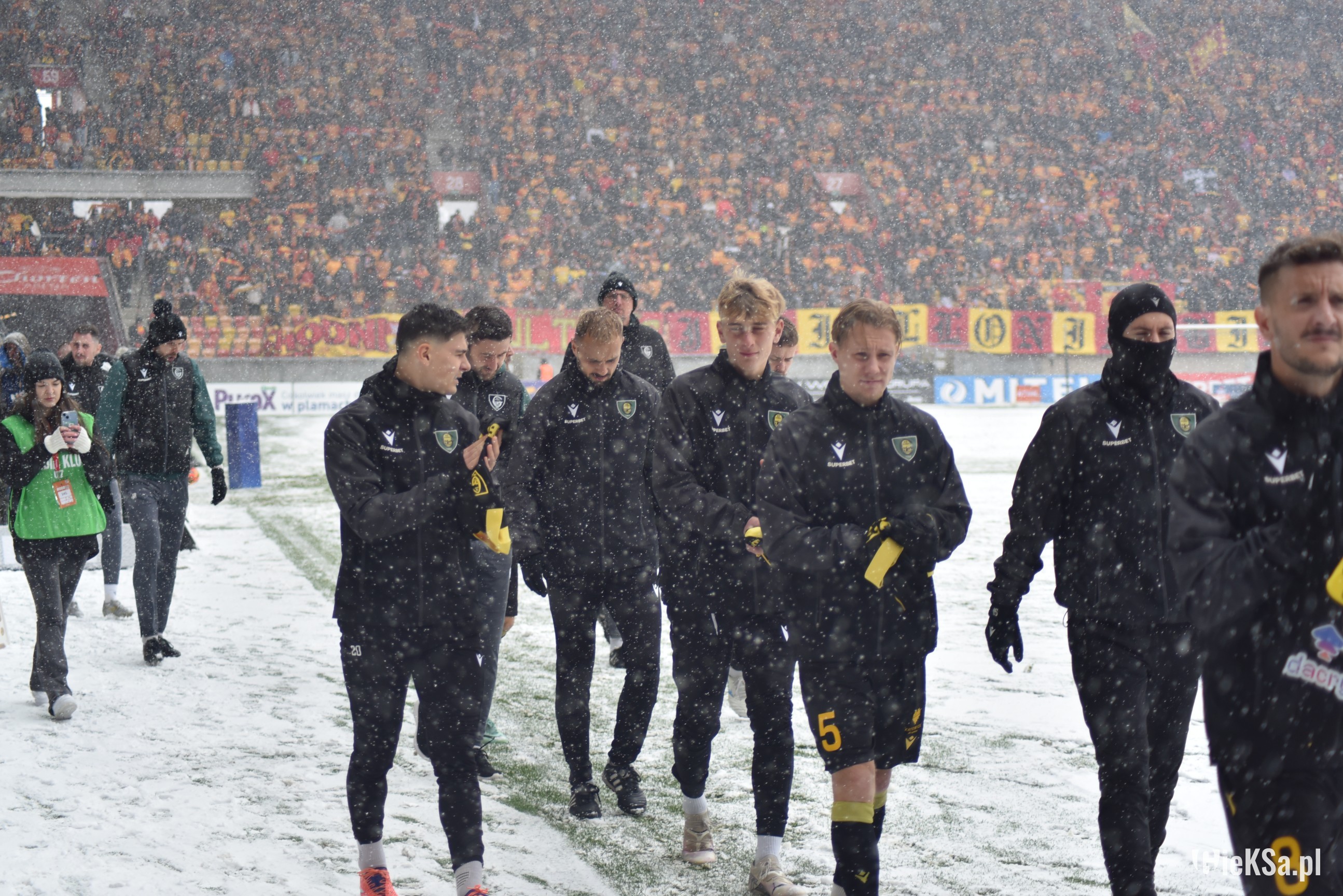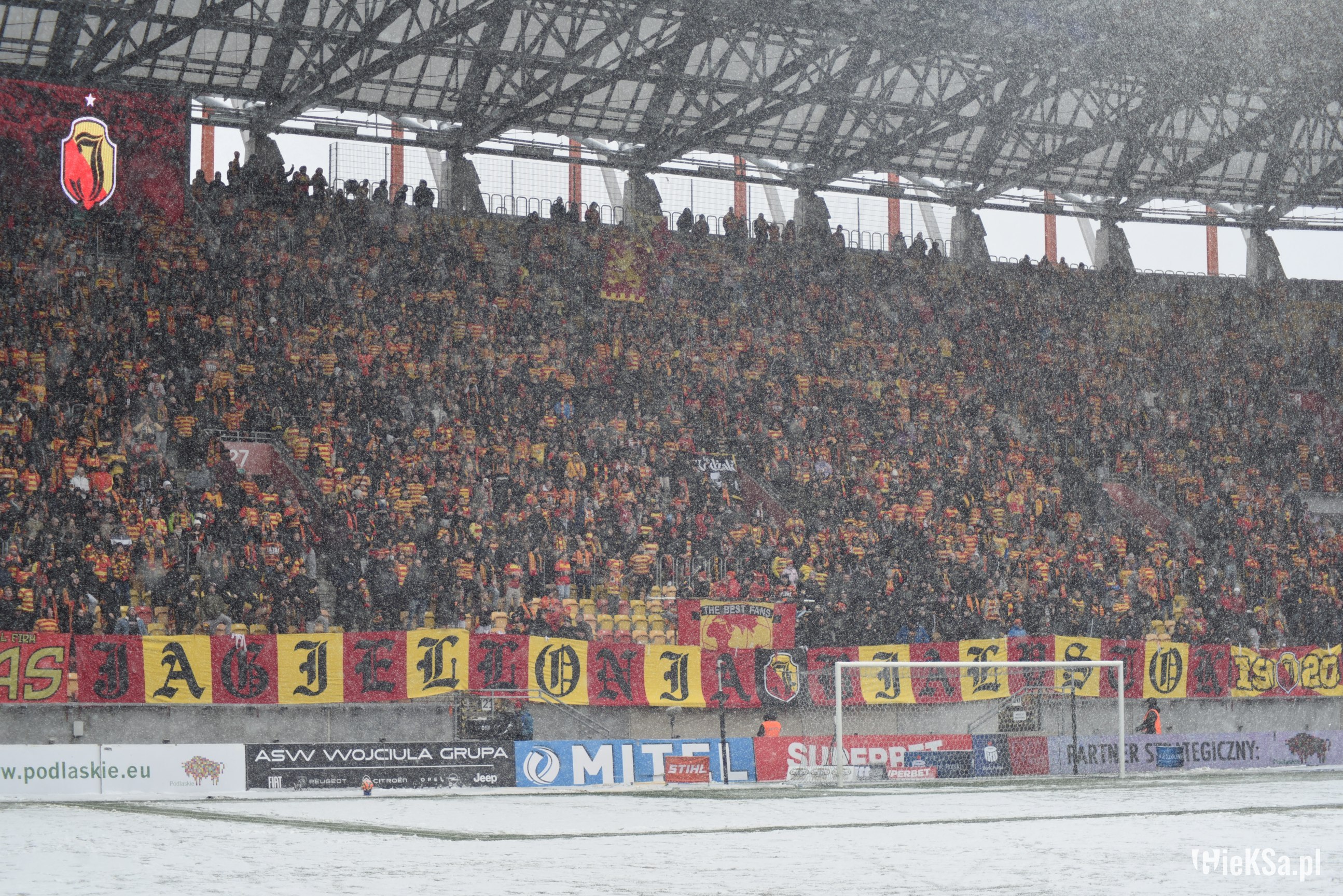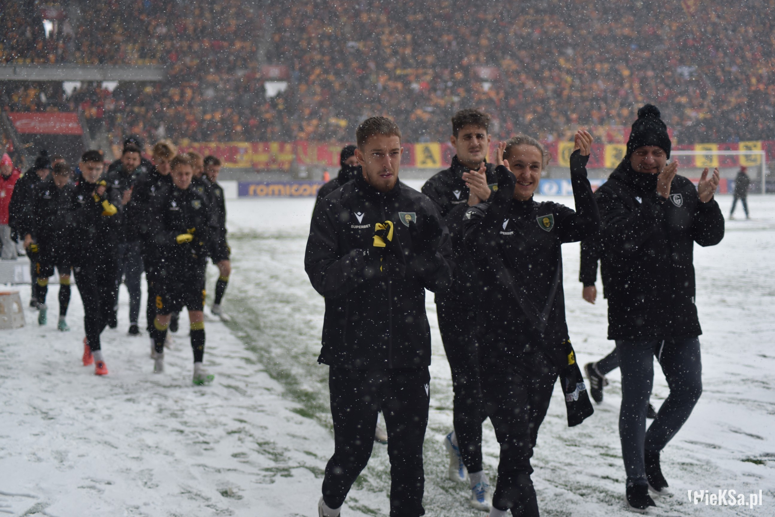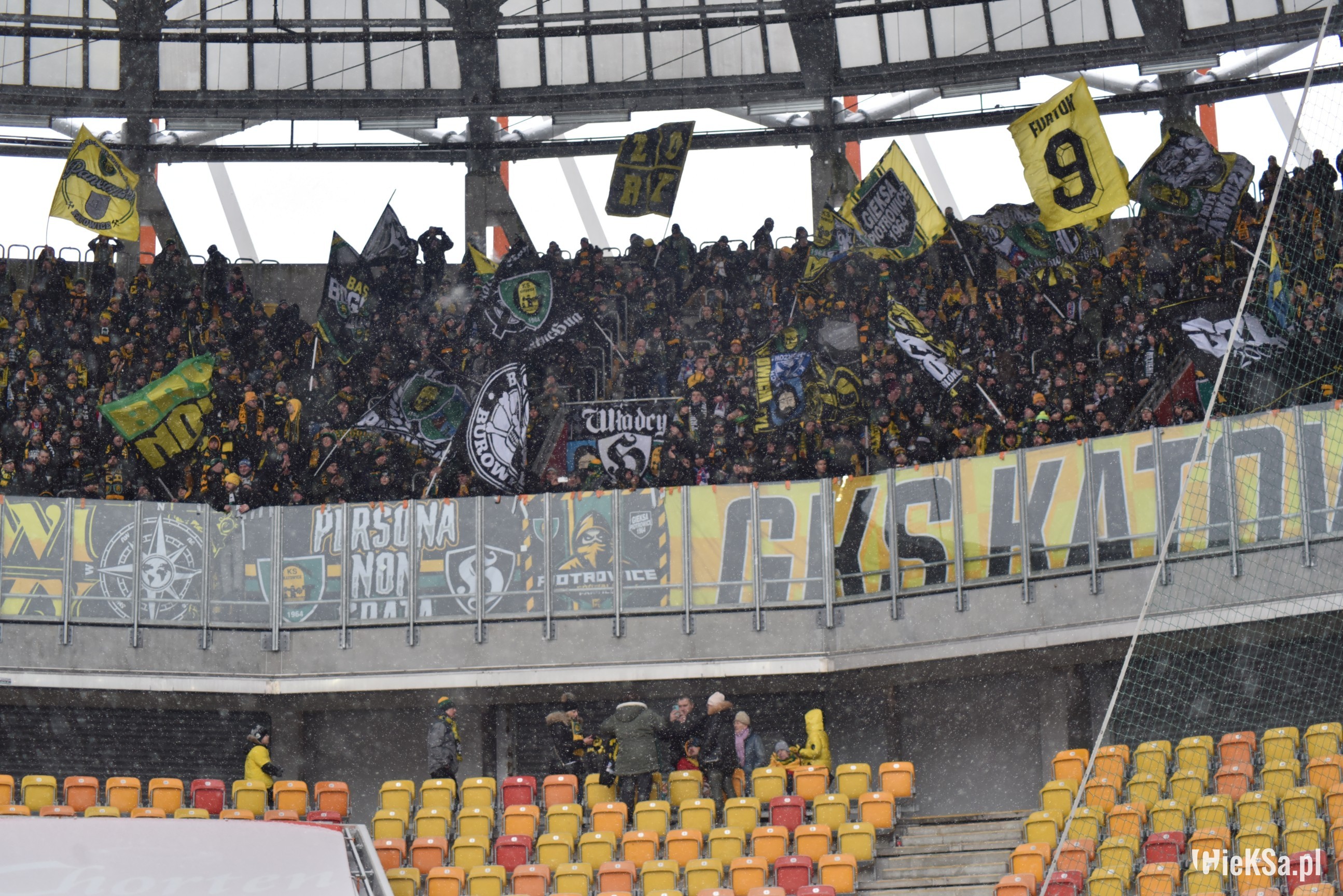 Zapraszamy do zimowej galerii z odwołanego meczu GieKSy z Jagiellonią w Białymstoku. Piłkarze GKS Katowice po decyzji o tym, że nie będzie spotkania, podeszli pod szczelnie wypełniony sektor gości i podziękowali fanom z Katowic za tak liczne stawienie się na meczu. Przy okazji podarowali swoje koszulki najmłodszym wyjazdowiczom.