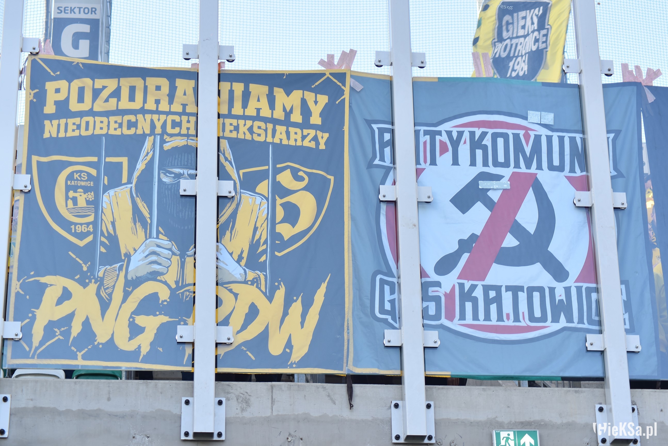 Właśnie w 2019 roku świętowaliśmy 10-lecie zgody z KSG. Podejmowaliśmy Gryf Wejheowo, a Blaszok zaprezentował transparent: „Łączy nas wiele złego i chuj wam do tego!”. Na sektorówce był Homer i Bart Simpson, którzy wspólnie pili piwo. Było to oczywiście nawiązanie do 2003 roku, kiedy będąc w Zabrzu i mając jeszcze kosę między sobą, zaprezentowaliśmy Homera, który dusił Barta. Nasza koalicja postanowiła uczcić rocznicę, ustawiając się na Piasta Gliwice, który jechał do Tychów, wspierać GKS Jastrzębie. Do niczego ostatecznie nie doszło, bo Piast wysiadł, ale obecni byli także mundurowi.